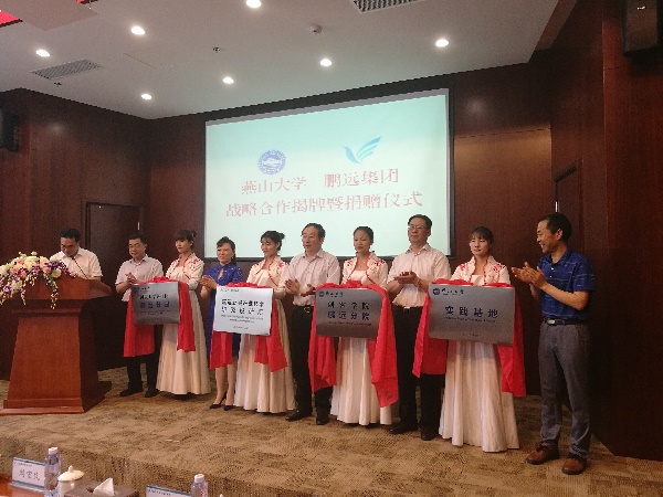 仪式上,与会嘉宾为“燕山大学-鹏远集团新兴产业技术研究设计院”、“燕山大学国家大学科技园鹏远分园”、“燕山大学创客学院鹏远分院”和“燕山大学鹏远实践基地”揭牌。河北鹏远企业集团向燕山大学捐赠100万元,用于支持燕山大学师生创新创业项目在鹏远实现初期孵化。