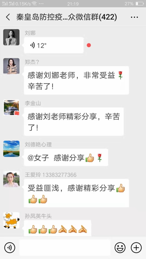 晚上八点,在秦皇岛防控疫情心理服务大众微信群内,刘娜老师讲了《突发疫情,如何照顾儿童心理》主题微课,针对不同年龄段的儿童在防控疫情的时期可能出现的认知、情绪、行为等各方面的问题,提出了帮孩子重建安全可控感、帮助孩子疏解情绪、帮助孩子认知与思辨、帮孩子保持社会联系、给孩子传递希望与关爱等方面的建议和方法。刘老师的讲座指导大家用科学的方法,为孩子做好心理防护,给孩子一份特别的爱。