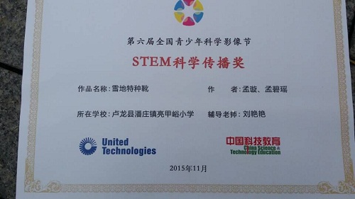 作者:admin | 更新时间:2015-11-19 | 点击量:288次11月12日,由中国科协青少年科技中心、中国青少年科技辅导员协会和广西壮族自治区科协共同举办的第六届全国青少年科学影像节活动在广西南宁闭幕,我市卢龙县潘庄镇亮甲峪小学孟璇、孟碧瑶两位同学的作品——《雪地特种靴》荣获全国一等奖、“‘科学万花筒’提名奖”以及“STEM科学传播奖”,这是近年来我市青少年在全国科学影像活动中获得的最高奖励。